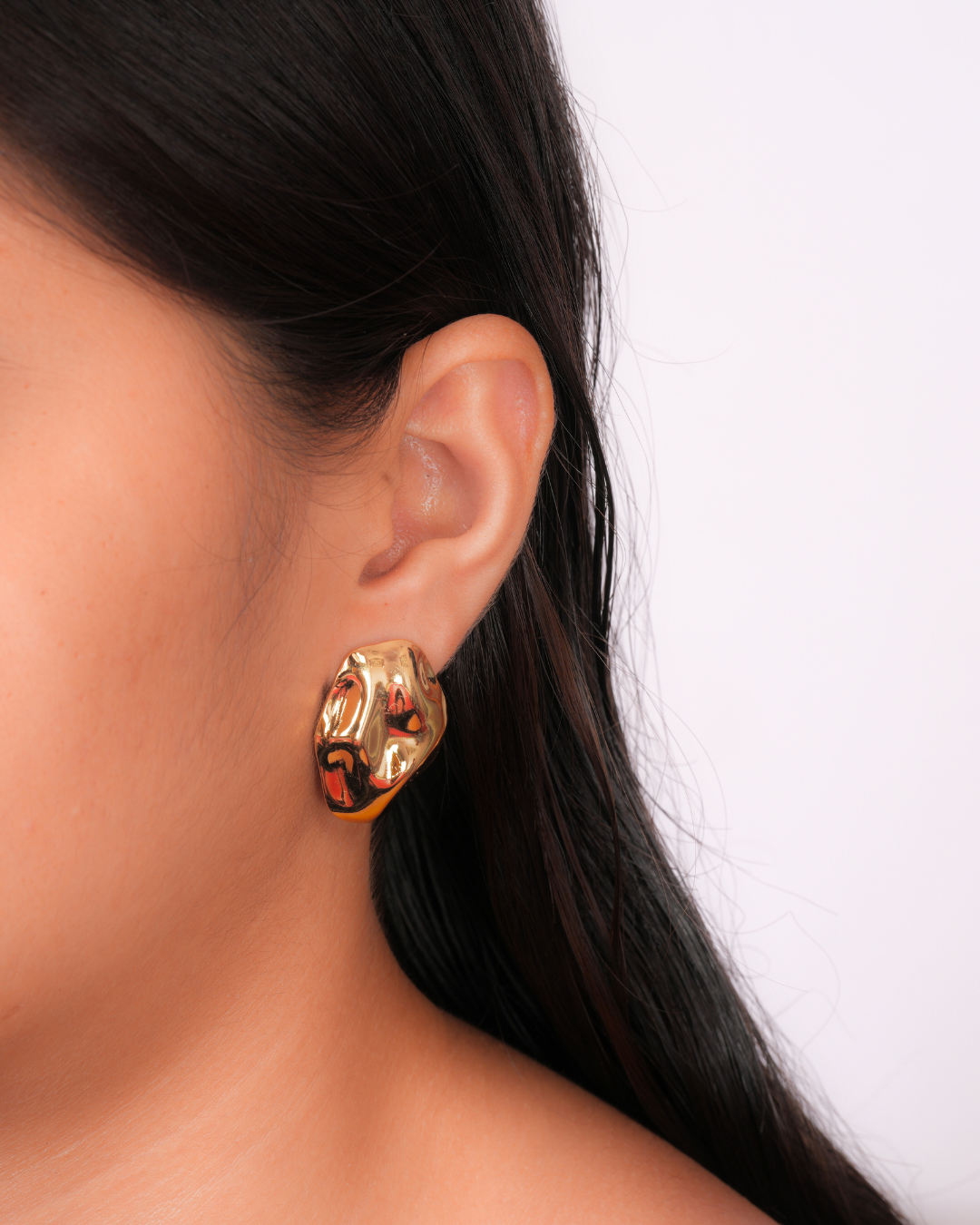 Golden Melties – bold molten-style studs in stainless steel, waterproof, skin-safe, and designed to make a striking statement.