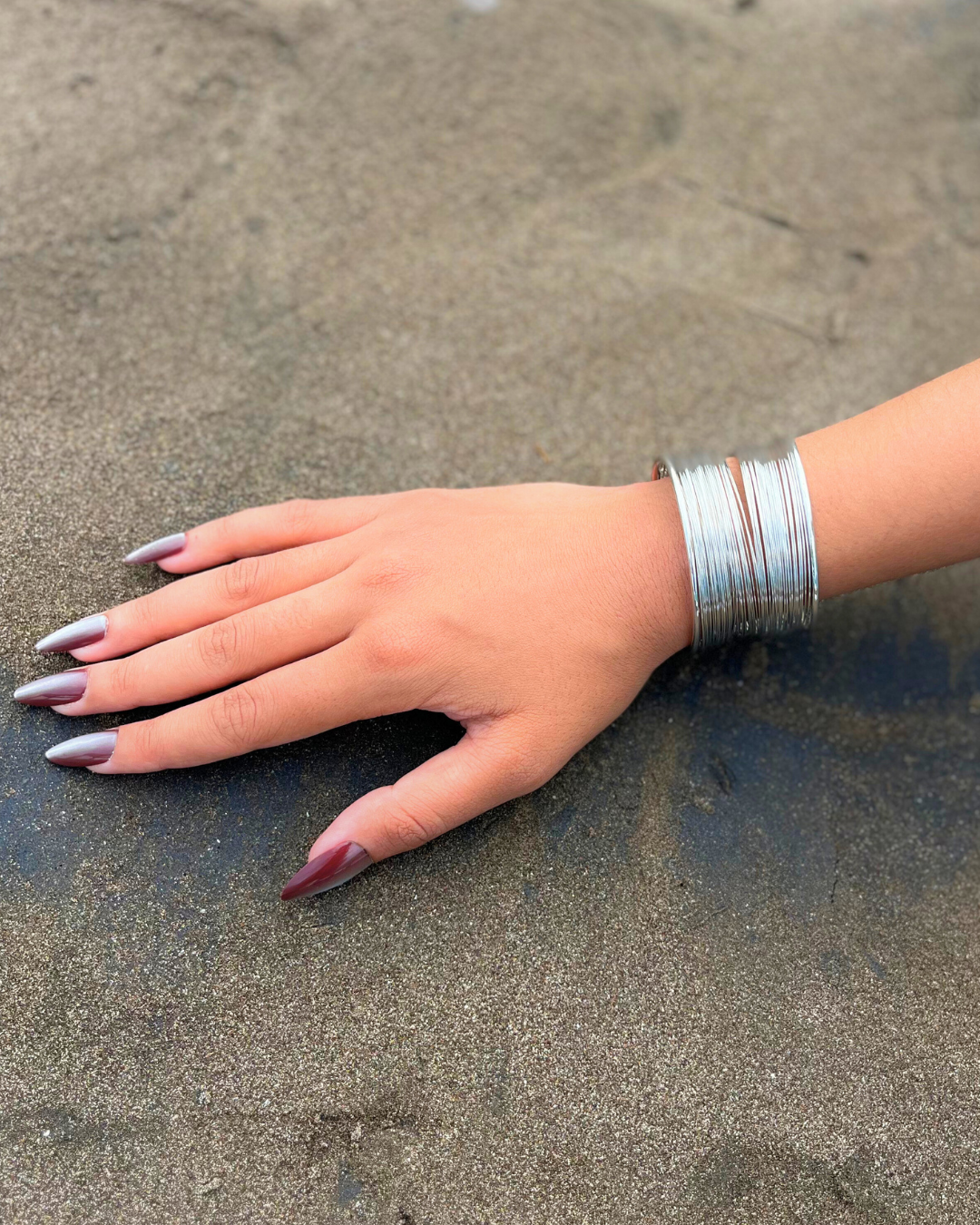 A timeless stack of sleek silver bangles that blend tradition with modern elegance. Perfect to wear with ethnic outfits or to add a bold touch to everyday looks.